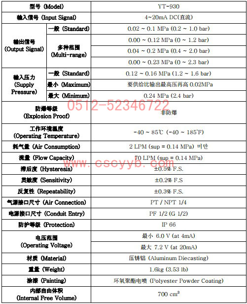 特征和功能 耗氣量小,對(duì)于大型工廠可節(jié)約能源,經(jīng)濟(jì)性好。 具有IP66優(yōu)秀的防護(hù)等級(jí),使用范圍寬大。 適用于底電壓(8.5V),因此對(duì)于一般的控制系統(tǒng)可以互換使用。 選用耐腐蝕性能強(qiáng)的環(huán)氧聚酯電噴處理,可在具有腐蝕性的大氣環(huán)境中長(zhǎng)時(shí)間。 使用零位(ZERO)或量程(SPAN)撥號(hào)盤,可以容易進(jìn)行設(shè)定。 內(nèi)部結(jié)構(gòu)非常簡(jiǎn)單,進(jìn)行了模塊化,減小了故障的幾率,維護(hù)簡(jiǎn)便。 氣源壓力的突然變化及嚴(yán)重振動(dòng)的環(huán)境下,可正常動(dòng)作。 安裝空氣過濾減壓閥 (YT-200)不需要單獨(dú)進(jìn)行氣管連接,更方便。 技術(shù)參數(shù)