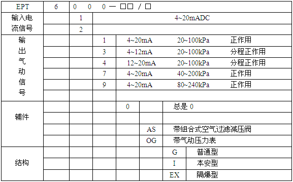 技術參數 例EPT6110---AS--OG/I表示該轉換器為EPT6000電/氣轉換器,輸入信號4--20mADC,輸出信號20—100kPa,帶組合式空氣過濾減壓閥及輸出壓力表,本安型。